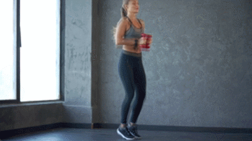 바닥에 서서 준비하세요. 손에는 아령이나 생수병을 들어줍니다. 점프 동작과 함께 다리를 벌립니다. 스쿼트 동작을 진행하세요. 원래 자세로 돌아오면서 점프하여 다리를 모아줍니다. 다시 점프하여 다리를 벌리고, 스쿼트 동작을 연결하세요. 1분간 진행합니다.