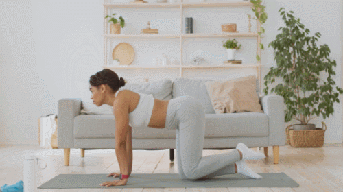 매트에 손과 무릎을 대고 엎드려서 네발기기 자세를 만듭니다. 팔꿈치를 펴주세요. 왼쪽 다리를 뒤로 뻗습니다. 발끝을 뻗어주세요. 왼쪽 다리를 들었다가 내리면서 30초 운동합니다. 오른쪽 다리를 뒤로 뻗고, 동일하게 30초 동안 운동하세요.
