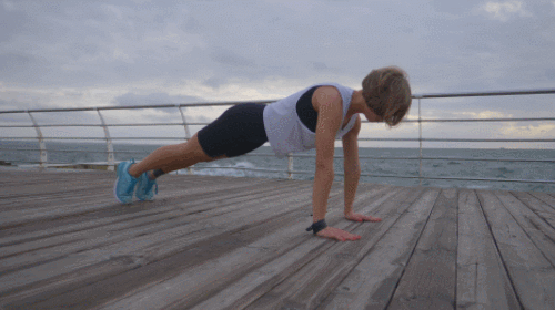 매트에 엎드린 상태에서 플랭크 자세를 만듭니다. 팔꿈치와 무릎을 완전히 펴고, 시선은 바닥을 응시합니다. 몸 전체를 곧게 뻗어주세요. 어깨에서 손목으로 내려오는 라인을 직선으로 유지합니다. 1분 동안 플랭크 자세로 버티세요.