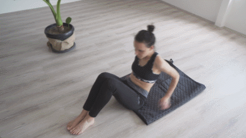 매트에 등을 대고 완전히 눕습니다. 다리를 공중으로 들고, 무릎을 구부리세요. 무릎을 상체 방향으로 최대한 당깁니다. 양손으로 정강이를 감싸면서 눌러주세요. 자세를 유지하면서 호흡합니다. 몸을 좌우로 움직이면 운동 효과를 높일 수 있습니다. 1분간 진행하세요.