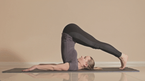 매트에 등을 대고 누운 상태로 시작하세요. 다리를 공중으로 들고, 머리 뒤로 완전히 넘겨주면 되는데요. 발끝으로 바닥을 터치하고, 자세를 유지하면서 버팁니다. 손으로 허리를 지탱하거나 바닥에 두면서 운동하세요. 1분간 반복합니다.