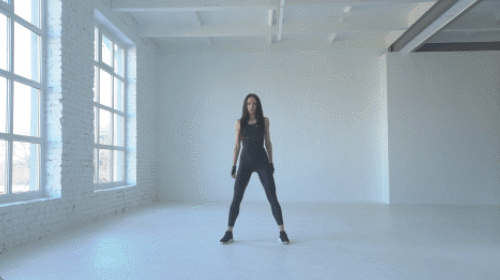 매트에 서서 다리는 넓게 벌립니다. 손은 가슴 앞에서 맞잡고, 시선은 정면을 바라봅니다. 무릎을 구부리면서 엉덩이를 충분히 내렸다가 원래 자세로 돌아옵니다. 1분 동안 와이드 스쿼트 동작을 진행하세요.