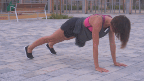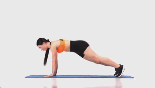 매트에 플랭크 기본자세로 엎드립니다. 플랭크 동작에서 손으로 어깨를 터치하거나 다리를 당기는 동작을 추가할 수 있는데요. 왼손으로 버티면서 오른손으로 왼쪽 어깨를 터치합니다. 오른손으로 버티면서 왼손으로 오른쪽 어깨를 터치하세요. 다리를 번갈아 당겨줍니다. 1분간 반복하세요.