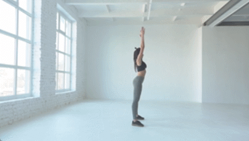 바닥에 서서 다리는 어깨너비보다 넓게 벌리세요. 손을 머리 위로 올립니다. 손을 바닥으로 내리면서 상체를 숙입니다. 엉덩이를 내려서 스쿼트 자세를 만듭니다. 손을 머리 위로 올리세요. 몸일 일으키면서 원래 자세로 돌아옵니다. 1분 동안 진행하세요.