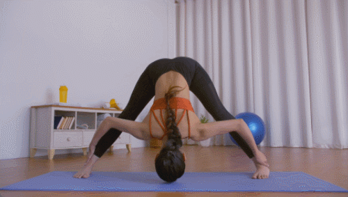 다리를 최대한 넓게 벌린 상태로 매트에 서서 시작합니다. 상체를 앞으로 숙이면서 손으로 바닥을 짚거나 발목을 잡아주면 되는데요. 유연성이 부족하면, 무릎을 구부리거나 다리 범위를 좁히세요. 1분간 운동합니다.