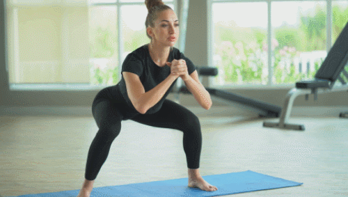매트에 다리를 넓게 벌린 상태에서 준비하세요. 무릎을 구부리면서 엉덩이를 최대한 낮춥니다. 손은 가슴 앞에서 모으세요. 자세를 유지하면서 최대한 버티면 되는데요. 1분 동안 버티는 동작을 반복합니다. 상체는 구부러지지 않도록 유의하세요.