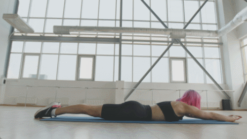 매트에 배를 대고 엎드리세요. 팔을 앞으로 뻗습니다. 손끝과 발끝을 최대한 뻗어서 몸을 늘여줍니다. 상체와 하체를 동시에 공중으로 들어줍니다. 스트레칭을 진행하세요. 자세를 유지하며 버텼다가 돌아옵니다. 1분 동안 반복하세요.