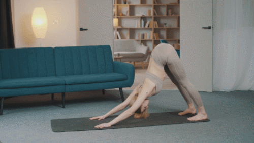 매트에 엎드려서 준비합니다. 엉덩이를 공중으로 높이 들어주세요. 상체를 내리면서 다운도그 자세를 잡습니다. 시선은 발끝을 향하도록 하세요. 팔꿈치와 무릎을 최대한 펴주세요. 호흡을 유지하면서 버팁니다. 1분 동안 반복하세요.