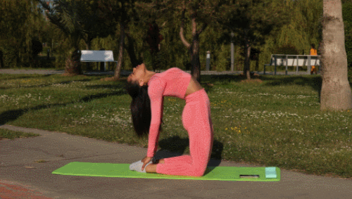 매트에 무릎을 꿇고 앉아서 시작합니다. 엉덩이를 들고, 상체를 일으켜 세웁니다. 손을 뒤로 뻗으면서 손으로 발을 잡으세요. 상체를 뒤로 젖힙니다. 낙타 자세를 유지하면 되는데요. 최대한 버텼다가 원래 자세로 돌아옵니다. 1분간 운동하세요.