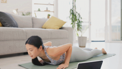 매트에 배를 대고 엎드려서 시작하세요. 손을 바닥으롤 누르면서 상체를 일으켜 세웁니다. 골반은 바닥에 붙인다는 생각으로 진행하면 되는데요. 상체를 열면서 확장시키고, 척추를 늘여주세요. 1분 동안 코브라 자세를 반복합니다.