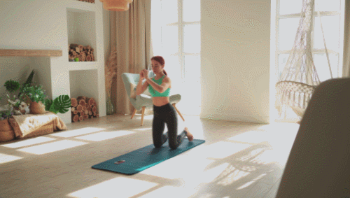매트에 무릎을 꿇고 앉아서 시작하세요. 상체를 일으켜 세웁니다. 손은 가슴 앞에서 잡으세요. 오른쪽 무릎을 세우면서 오른발을 매트에 붙이세요. 왼쪽 무릎을 세우면서 왼발을 매트에 붙입니다. 스쿼트 자세를 만드세요. 다시 무릎을 꿇고 앉으면서 반복합니다. 1분간 운동하세요.