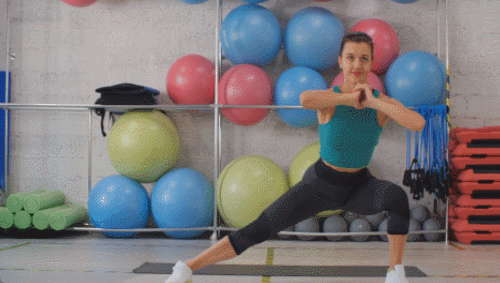 바닥에 서서 다리를 넓게 벌립니다. 손은 가슴 앞에서 모으고, 시선은 정면을 응시합니다. 오른쪽 무릎을 구부리면서 상체를 이동했다가 돌아옵니다. 이번에는 왼쪽 무릎을 구부리면서 상체를 이동하세요. 1분 동안 운동합니다.