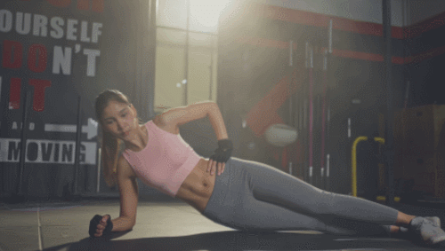 매트에 오른쪽 팔뚝을 대고 옆으로 눕습니다. 왼손은 옆구리로 가져가세요. 엉덩이를 들어서 사이드 팔꿈치 플랭크 자세를 만듭니다. 업다운 동작을 30초 진행하세요. 반대편으로 돌아서 눕습니다. 동일하게 반복하세요. 30초 운동합니다.