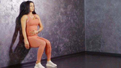 벽 앞에 서서 준비하세요. 벽에 등을 기대고 무릎을 구부립니다. 스쿼트 자세를 만드세요. 허벅지가 바닥과 평행하도록 충분히 내립니다. 자세를 유지하고 버팁니다. 다리를 벌렸다가 오므리는 동작을 추가하세요. 1분 동안 반복합니다.