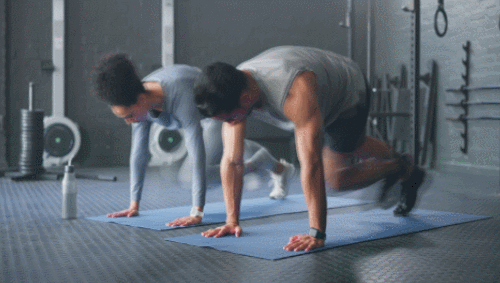 매트에 엎드려서 플랭크 자세로 시작합니다. 왼쪽 무릎을 오른쪽 팔꿈치를 향해 당겼다가 되돌리세요. 오른쪽 무릎을 왼쪽 팔꿈치로 당겼다가 되돌립니다. 다리를 번갈아 크로스 방향으로 당겨주면 되는데요. 1분 동안 운동합니다. 팔꿈치는 편 상태를 유지하세요.