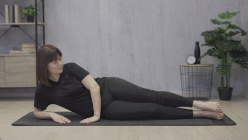 오른쪽 팔뚝을 대고 옆으로 누워서 시작하세요. 왼손은 바닥에 붙입니다. 왼쪽 다리는 공중으로 들었다가 내리면서 운동을 진행합니다. 30초 운동하세요. 반대편으로 돌아서 눕습니다. 오른쪽 다리로 동일하게 30초 반복하세요. 운동 중에는 무릎을 완전히 펴줍니다.