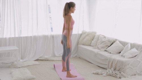 매트에 서서 어깨너비보다 다리를 넓게 벌립니다. 무릎을 구부리면서 엉덩이를 바닥으로 내리세요. 손은 가슴 앞에서 모았다가 일어서면서 내려줍니다. 시선은 정면을 바라봅니다. 상체는 구부정하지 않도록 주의하세요. 1분 동안 진행합니다.