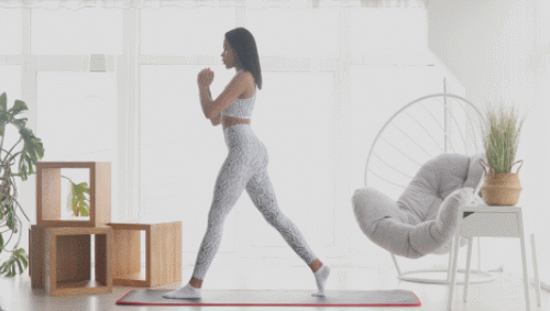 매트에 서서 준비하세요. 왼발을 앞으로 내딛습니다. 무릎을 구부리면서 런지 동작을 진행하세요. 무릎을 90도 각도로 만드세요. 손은 가슴 앞에서 모았다가 내려줍니다. 30초 운동하세요. 오른발을 앞으로 내딛고, 동일하게 30초 운동합니다.