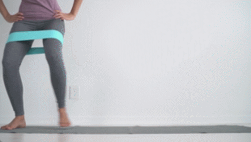 매트에 서서 허벅지 사이에는 밴드를 착용합니다. 무릎을 약간 구부리고, 손을 옆구리로 가져갑니다. 왼쪽 다리를 왼쪽으로 움직이면서 사이드 워크 동작을 진행하세요. 이번에는 오른쪽 다리를 오른쪽으로 움직이면서 반복합니다. 1분 동안 운동합니다.