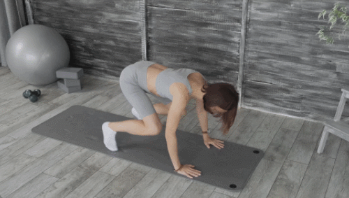매트에 플랭크 기본자세로 엎드립니다. 오른쪽 무릎을 구부리면서 발을 당기세요. 왼쪽 무릎을 구부리면서 발을 당깁니다. 다시 오른발을 제자리로 되돌립니다. 왼발도 원래 자세로 돌아가세요. 1분 동안 발을 번갈아 움직이면서 운동합니다.
