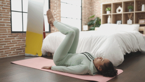 매트에 누운 상태에서 손은 바닥에 고정합니다. 다리는 공중으로 들고, 무릎을 구부리세요. 왼쪽 발을 내리면서 발끝을 터치하고 돌아오세요. 오른쪽 발을 내리면서 발끝을 터치하고 돌아옵니다. 복부에 힘을 주고, 1분 동안 운동합니다.