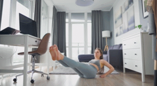 매트에 누운 다음 손을 바닥으로 밀면서 상체를 세웁니다. 무릎을 구부리고, 발은 바닥에 둡니다. 상체를 일으키면서 무릎을 당겨서 발을 공중으로 띄우세요. 1분 동안 복부를 자극하는 움직임을 반복하세요.