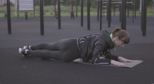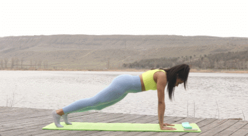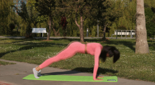 플랭크 동작으로 시작합니다. 엉덩이를 들면서 상체를 낮추세요. 다운도그 자세로 전환합니다. 무릎을 구부리면서 몸을 낮추세요. 다시 플랭크 기본자세로 돌아옵니다. 2가지 동작을 1분 동안 반복하세요. 손과 발이 매트에서 떨어지지 않도록 합니다.