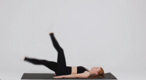 매트에 누운 상태로 다리는 바닥과 90도 각도로 들어줍니다. 왼발을 내렸다가 들어주면서 오른발을 내려주세요. 발을 번갈아 교차하면서 빠르게 움직이면 되는데요. 1분 동안 운동합니다. 운동 중에는 발이 바닥에 닿지 않도록 하세요.