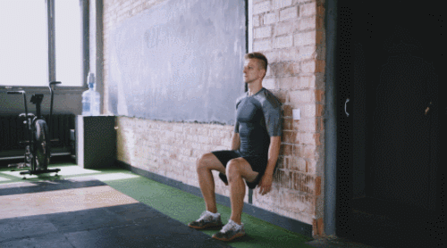 벽 앞에 서서 준비합니다. 벽에 등을 기대고 무릎을 구부리세요. 엉덩이를 충분히 내려줍니다. 허벅지가 바닥과 평행하도록 만드세요. 손은 가슴 앞에서 잡거나 내려주세요. 시선은 정면을 응시하세요. 자세를 유지하면서 최대한 버팁니다. 1분간 운동하세요.