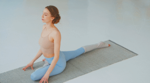매트에 앉아서 왼쪽 다리는 앞으로 뻗고, 오른쪽 다리는 뒤로 뻗습니다. 왼쪽 무릎을 구부리면서 발을 최대한 당겨주세요. 자세를 유지하며 스트레칭합니다. 다리 위치를 바꿔서 반복하세요. 1분 동안 운동합니다.