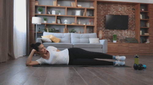 오른쪽 측면을 옆으로 대고 누워서 시작합니다. 오른손으로 머리를 지탱하세요. 왼쪽 다리를 공중으로 들었다가 내리면서 30초 동안 운동합니다. 이번에는 자세를 바꿔서 반대편으로 눕습니다. 오른쪽 다리를 들었다가 내리면서 30초 운동하세요.