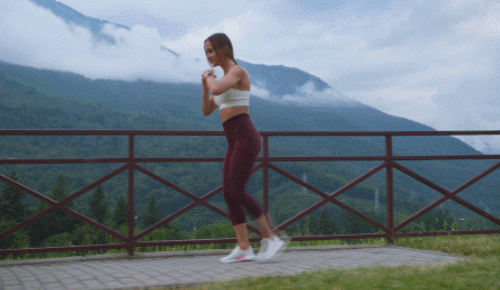런지 동작을 진행하면서 앞으로 움직이세요. 손은 가슴 앞에서 모아서 잡아줍니다. 왼발을 앞으로 뻗고, 무릎을 90도로 구부리면서 런지 자세를 잡습니다. 이번에는 오른발을 앞으로 당겨서 뻗으세요. 런지 동작으로 연결합니다. 1분간 운동하세요.