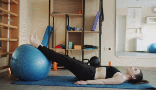 매트에 누워서 발을 짐볼 위에 올립니다. 짐볼이 없다면 소파나 의자에 올리고 시작하세요. 무릎이 구부러지지 않도록 충분히 거리를 두고 누워주세요. 엉덩이를 들어서 몸을 사선으로 만듭니다. 천천히 원래 자세로 돌아오세요. 1분 동안 진행합니다.