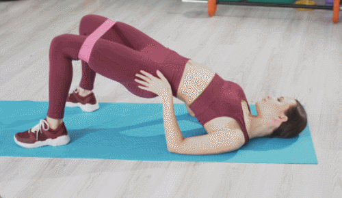 매트에 누운 상태에서 허벅지 사이에는 밴드를 끼웁니다. 무릎을 당겨서 세우고, 발은 바닥에 붙이세요. 엉덩이를 들어서 브릿지 자세를 만듭니다. 자세를 유지하면서 다리를 벌렸다가 오므리세요. 1분 동안 반복합니다. 엉덩이를 자극하세요.