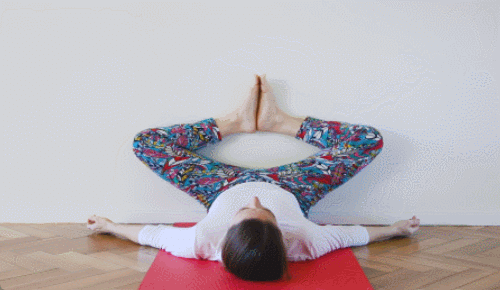 벽 앞에 매트에 눕습니다. 다리를 벽에 기대고 자세를 준비하세요. 팔은 옆으로 펼쳐서 편하게 둡니다. 무릎을 구부리고, 발을 당겨서 자세를 잡습니다. 자세를 유지하면서 호흡하세요. 1분 동안 스트레칭을 진행합니다. 몸을 충분히 풀어주세요.