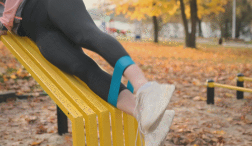 허벅지에 밴드를 착용하고, 등을 소파나 벤치에 대고 눕습니다. 무릎은 90도 각도를 만드세요. 엉덩이를 바닥으로 내렸다가 드는 동작을 반복하면 되는데요. 손은 가슴 앞에서 모으고, 1분간 진행하세요.