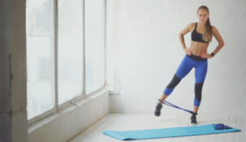 바닥에 서서 준비하세요. 다리에는 밴드를 착용합니다. 손은 옆구리로 가져가세요. 오른쪽 다리를 오른쪽으로 들었다가 내리면서 30초 운동하세요. 이번에는 왼쪽 다리를 왼쪽으로 들었다가 내리면서 운동합니다. 30초 반복하세요.