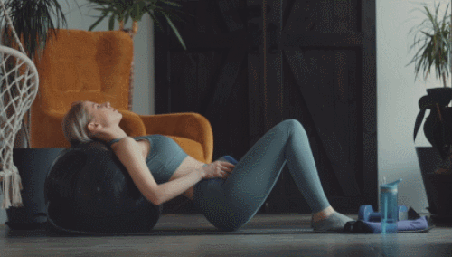 소파나 짐볼에 등을 대고 누워서 준비하세요. 손에는 아령이나 생수병을 들고, 골반 위에 올려줍니다. 어깨에서 무릎까지 이어지는 라인을 직선으로 맞추세요. 엉덩이를 바닥으로 내렸다가 드는 동작을 반복합니다. 1분 동안 운동하세요.