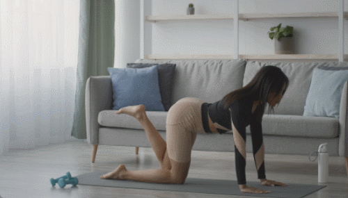 매트에 네발기기 자세로 엎드려서 준비합니다. 왼쪽 다리를 공중으로 뻗어주세요. 팔꿈치는 완전히 뻗고, 시선은 바닥을 응시합니다. 다리를 들었다가 내리면서 30초 운동합니다. 이번에는 오른쪽 다리를 공중으로 뻗고, 30초 동안 반복합니다.