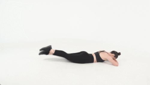 배를 대고 매트에 엎드려서 시작하세요. 손을 턱밑으로 가져가서 준비합니다. 다리는 공중으로 띄우세요. 발끝을 뻗어줍니다. 다리를 바닥으로 내렸다가 드는 동작을 반복합니다. 발끝을 뻗은 상태로 유지하세요. 1분 동안 진행합니다.