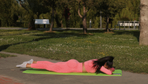 매트에 배를 대고 엎드려서 시작하세요. 팔은 구부려서 턱밑으로 가져옵니다. 다리를 공중으로 들어주세요. 왼발을 들었다가 내리면서 오른발을 들어주세요. 수영을 하는 것처럼 다리를 빠르게 움직이세요. 1분 동안 반복합니다.