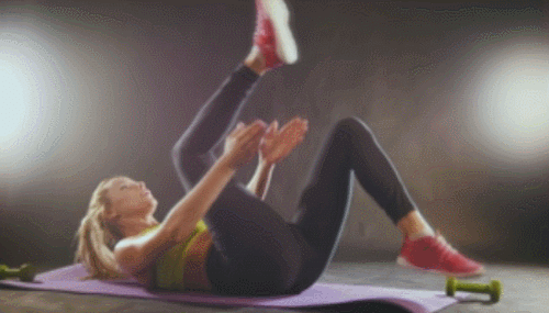 매트에 누운 상태로 손을 머리 옆으로 옮깁니다. 다리를 공중으로 올리세요. 오른쪽 무릎을 당기면서 상체를 일으키면서 틀어줍니다. 왼쪽 무릎을 당기면서 상체를 틀어주세요. 무릎을 번갈아 당겨주면서 반복합니다. 1분 동안 진행하세요.