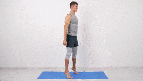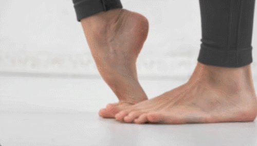 바닥에 서서 시작합니다. 발꿈치를 동시에 공중으로 올립니다. 발꿈치를 내리면서 원래 자세로 돌아오세요. 이때 발가락을 들어주세요. 발꿈치를 드는 동작을 반복하면 되는데요. 균형을 잡기 어렵다면, 도구를 잡고 진행합니다. 1분 동안 운동하세요.