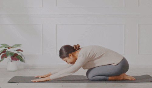 매트에 무릎을 꿇고 앉아서 시작하세요. 상체를 앞으로 숙이면서 팔을 뻗어줍니다. 손끝을 펴고, 상체를 최대한 늘여주세요. 이마는 바닥에 붙인 상태로 호흡을 이어갑니다. 엉덩이가 발꿈치에 닿을 수 있도록 진행하세요. 1분간 운동합니다.