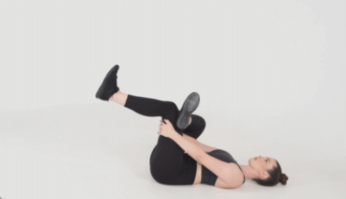 매트에 누운 상태로 왼쪽 무릎은 세우고, 오른쪽 다리는 왼쪽 다리 위에 걸칩니다. 다리 사이의 공간으로 손을 넣고 당겨주면 되는데요. 30초 동안 운동합니다. 이번에는 다리 위치를 바꾸고, 당기는 동작을 30초 진행하세요.