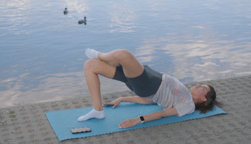 매트에 누운 상태에서 무릎을 세웁니다. 왼쪽 다리를 오른쪽 무릎 위에 걸치세요. 엉덩이를 들어서 브릿지 자세를 만듭니다. 자세를 유지하고 30초 동안 버티세요. 이번에는 다리 위치를 바꾸세요. 오른쪽 다리를 왼쪽 무릎 위에 걸칩니다. 30초 동안 반복합니다.