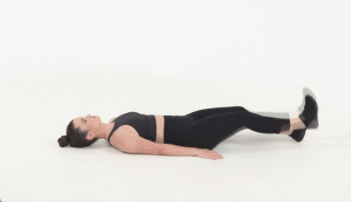 매트에 등을 대고 누운 상태에서 준비합니다. 다리를 공중으로 들고, 무릎을 90도로 구부리세요. 오른쪽 다리를 바닥으로 내립니다. 발끝을 터치하고 돌아오세요. 동시에 왼쪽 다리를 바닥으로 내리세요. 발끝을 터치하고 돌아옵니다. 1분간 반복하세요.