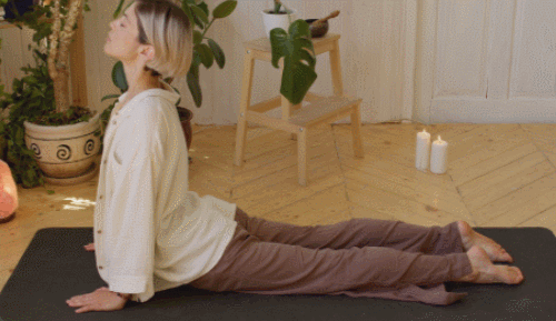 매트에 배를 대고 엎드려서 시작하세요. 손을 바닥으로 누르면서 상체를 일으켜 세웁니다. 골반은 바닥에 붙인다는 생각으로 진행하면 되는데요. 상체를 열면서 확장시키고, 척추를 늘여주세요. 1분 동안 코브라 자세를 반복합니다.