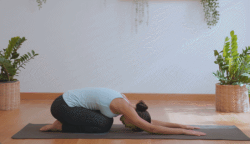 매트에 무릎을 꿇고 앉아서 준비하세요. 상체를 앞으로 숙이면서 팔을 뻗어줍니다. 손끝을 늘여준다는 생각으로 엎드리세요. 이마를 바닥에 대고 호흡합니다. 엉덩이가 발꿈치에서 떨어지지 않도록 하세요. 1분 동안 진행합니다.