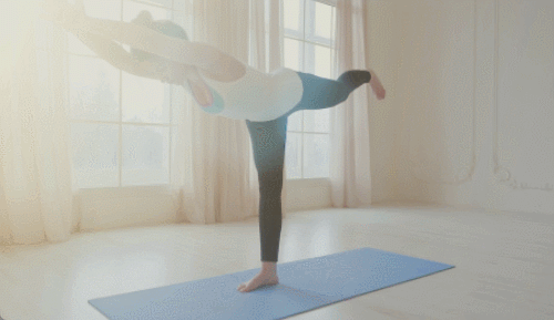 매트에 서서 시작합니다. 오른발로 버티면서 왼발을 뒤로 뻗으세요. 상체는 앞으로 숙입니다. 몸을 T자 모양으로 만드세요. 팔도 앞으로 뻗어줍니다. 30초 운동하세요. 이번에는 왼발로 버티면서 오른발을 뻗습니다. 30초 동안 반복하세요.